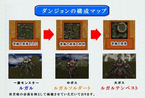 最初のダンジョン「苦痛の奈落」では、狂暴なモンスター「ルガル」がその行く手を阻んでいます。各モンスターは特徴的な能力を秘めており、それぞれにあわせた戦いをしなければなりません。そして、奈落の奥深くでは、凶悪なモンスター達を統括するボスモンスターが待ち受けています。