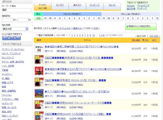 調査結果といたしましては、国内最大手とされるネットオークションポータル「Yahoo!オークション」で2009年1月2日に「東芝大型テレビ福袋」が558件で最高入札数を獲得、前年の三が日最高入札数となった「任天堂最新ゲーム機福袋」(2008年1月2日落札)の158件の約3.5倍の入札数量を記録しました。