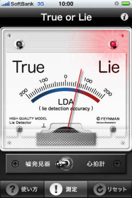 「True or Lie」は、脈の音(心拍数)を測定し、嘘をついているかどうかを判定する嘘発見器です。