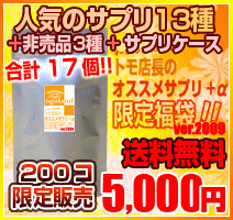 オーガランド楽天市場店では【店長トモのオススメサプリ+α福袋】として13種類の人気サプリメントと3種類の非売品サプリメント、サプリケースが入った福袋を2009年1月31日までの期間限定で税込5,000円、送料無料にて200セット販売する。