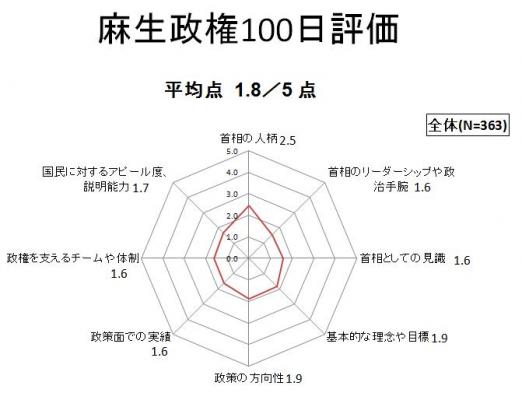 麻生政権の100日の全般評価では「内政・外交のいずれも評価できない」が58.7%に及び、内政に関しては1.7%しか評価する回答はありませんでした。また、「首相の資質」に関しては「首相の人柄」「首相の政策決定におけるリーダーシップや政治手腕」「首相としての見識、能力や資質」など8項目の評価を5点満点で行いましたが、全体の平均は5点満点中1.8点となり、福田政権時の2.3点、安倍政権時の2.2点よりもかなり低いものとなりました。