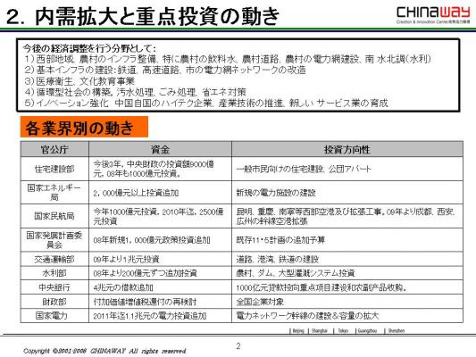 本資料では中国政府の景気刺激策の仕掛けと、中国での各業界別の資金、投資方向性について一覧できるようまとめました。
