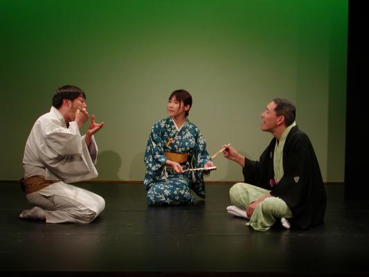 噺劇では、複数の役者が扮装ではないフツウの着物を着てお芝居をします。大道具、舞台背景は一切ありません。小道具は扇子と手拭いです。音楽・効果音は、三味線・鳴物のナマ演奏です。題材は落語の演目から選びます。