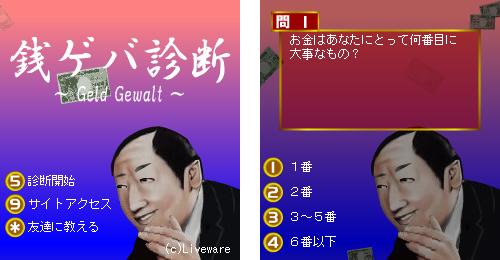 モバイルコンテンツの開発・配信を行う株式会社ライブウェア(本社:東京都新宿区、代表取締役社長:武内 智裕)は、1月21日(水)に携帯電話3キャリアの公式サイト「三文堂」内にて新作Flashゲーム「銭ゲバ診断」の配信を開始いたしました。