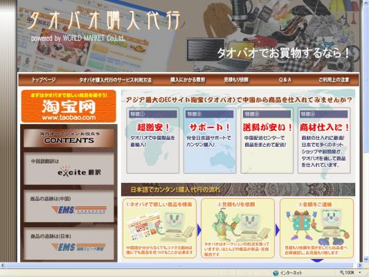 中国最大・世界第2位の規模を誇るショッピング・オークションサイト「Taobao」(タオバオ)http://www.taobao.com/での日本在住のユーザーからの購入手続~検品~配送までを代行するサービスです。