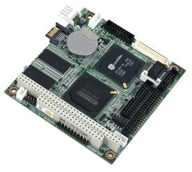 オンボードでSDRAM 64MBメモリ、SMI 712 PCI グラフィックスコントローラを搭載し、TTL LCD液晶出力に対応します。I/Oとして、USB 2.0 x2や、COM x4(RS-232x3、RS-232/422/485x1)を搭載、PC/104拡張バスにより、多様な周辺機器との接続と制御を実現します。