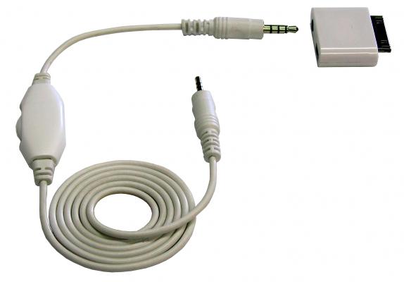iPod/iPhoneのコンポジットビデオ信号と音声信号を、ポケットプロジェクターに入力、モニターの無い場面で拡大映像を再現する専用ケーブル。