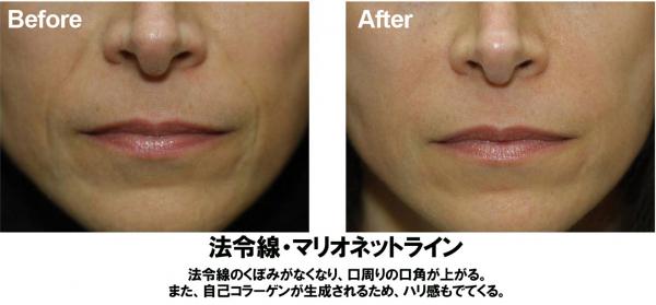 ・法令線・マリオネットライン(口の横から顎にむかってできる深いシワ。40代前後からできると言われている。)・頬部・鼻・眉間・こめかみ・顎のシワ、ライン・フェースライン
