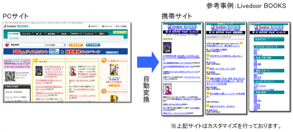 ネクシム・コミュニケーションズ株式会社(http://www.nexm.jp/)のWeb変換サービスの技術を利用しPC向けのWebコンテンツをモバイル画面に合わせてリアルタイムで自動変換するサービスです。既存PCサイトの内容を解析し、3キャリア対応の携帯サイトを自動生成します。変換はすべて変換サーバ側で行うため、携帯電話側に特別なクライアントソフトをインストールする必要はありません。