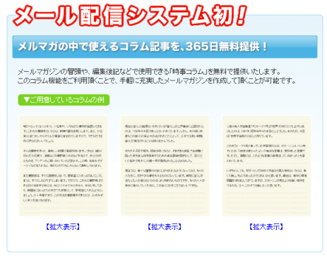 コラム機能をご利用頂くことで、記事内容のネタ探しで苦労されたり、専属のライターさんへの外注費等の費用をかけることなく、プロモーション活動やコミュニケーションツールとして、手軽に充実したメールマガジンを作成することが可能です。