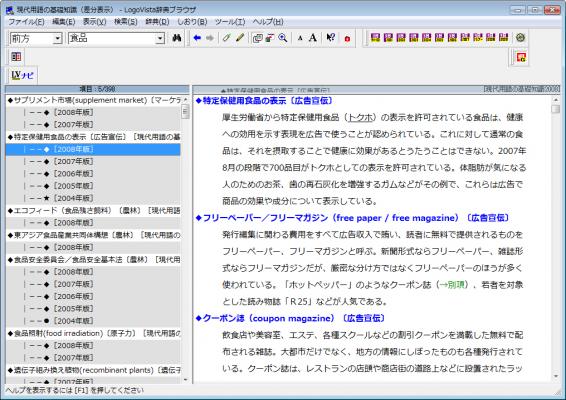 LogoVista電子辞典ならではの機能として、19年分のデータの中で解説の変更された箇所が色分け表示されるので、言葉が時代と共にどのように変化していったかなど変遷や歴史がひと目でわかる差分抽出機能を搭載しているのが最大の特長です。