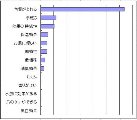 「フットケア製品に一番求める効果は何ですか?」との質問で最も多かったのが、「角質がとれること」で60%で突出しました。中でも、「効果が目に見えてわかることが重要」「確実な効果を期待」等のコメントが多く寄せられました。次いで「自宅でできる」「手を汚さずにできる」などの『手軽さ」が12%、『効果の持続性』が10%。以下、「保湿効果」5%、「お肌に優しい」4%、「即効性」4%、「低価格」3%と続きました。