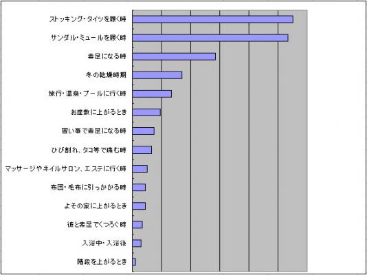 以下、「旅行・温泉・プール等に行く時」6%、「お座敷に上がるとき」4%、ヨガなどの「習い事で素足になる時」4%と続きました。