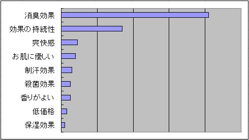 ■デオドラント製品に求めることで最も多いのは、「消臭効果」、次いで「効果の持続性」が重要。