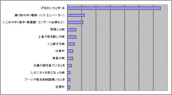 汗をかかなくても体臭が気になるシチュエーションとしては、「乗り物の中(電車・バス・エレベーター)」が一番多く20%、次いで、「人ごみの中(街中・映画館・コンサート会場など)」が18%となり、その他も人に接する場面が多く上がりました。
