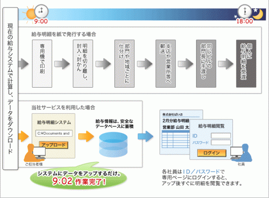 給与担当者様が、丸一日かけていた給与明細書の印刷、封入、配布作業が、給与データを「スパイラル(R)」にアップロードする2分に短縮できます。