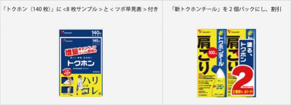 「トクホン(140枚)」に<8枚サンプル>と<ツボ早見表>を添付し、「新トクホンチール(100mL)」をお得な2個パックにした、2種類のトクホン商品を準備致しました。