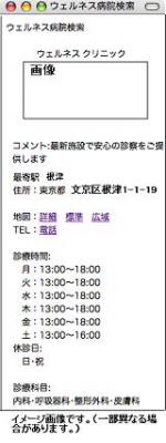 モバイル医療機関検索「ウェルネス病院検索」http://m.wellness.co.jp/ では、メディカル・アタッシュ・ドゥ・プレスサービス(M.A.P.サービス)http://www.wellness.co.jp/healthcare/index.htmlへ医療機関が登録することにより、先生の顔写真・施設の内観・外観、医療機関の特長をアピールするコメント情報なども掲載される、医療機関向けサービスとも連動している。