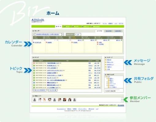 ビズナノティは、企業内での様々なプロジェクト利用に特化したSNS構築サービスです。話題ごとに重要度を設定できる「トピックス(掲示板)」、メンバー全員の予定と個人の予定を登録・参照できる「カレンダー」、文書や画像等のデータをアップロードできる「共有フォルダ」など、プロジェクト内の情報共有に必要な機能を備えており、特別なソフトや機器は一切使わず、パソコンとインターネット接続環境があれば、誰でも簡単に導入することができます。また、ビズナノティは、ユーザーのITスキルを問うことなく、簡単に操作できるように設計されています。