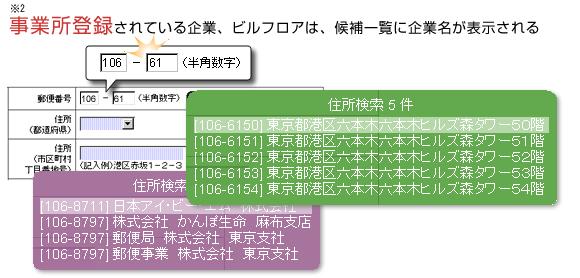 また、個別郵便番号を保有している事業所、ビルフロアは、企業名まで自動で表示、入力ができます。(※2) 「ナビキャスト フォームアシスト」はページにタグを貼るだけで使えるため、入力フォームの改修は必要ありません。すでに「ナビキャスト フォームアシスト」を導入されている入力フォームには、追加料金なしでご利用いただけます。