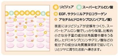 ◆EGF、AC-11、スーパーヒアルロン酸、コラーゲンなどの各種成分を独自のバランスで配合することによりお肌のうるおいや柔軟性を1日中キープ