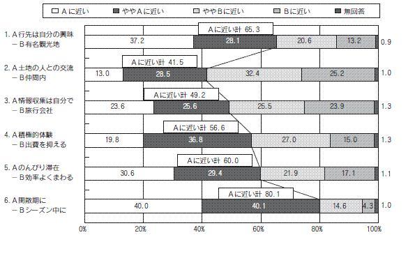 図表1の示すように、レジャー白書調査によれば、「1. テーマ志向」「2. 交流志向」「3. 情報積極性」「4. 体験志向」「5. 滞在志向」「6. オフ志向」の6つの視点についてA・Bの対立軸を設定し、どちらかといえば新しい旅の価値観を反映していると思われる項目を「Aに近い」方に配して、どちらに考え方が近いかをたずねたところ、「Aに近い」という回答が過半数を超す項目が6問中4問となり、「新しい旅の価値観」が定着してきていることがわかります。