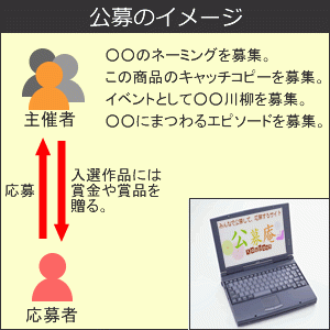 公募とは、企業や団体及び個人がネーミングや川柳、イラスト、写真、メッセージ、感想文、推薦コメント、俳句、キャッチコピー、小説等あらゆる作品を広く一般から募集することです。主催者がテーマや応募形式・内容を自由に設定でき、意欲をもった方が多く集まるため、高いパブリシティ効果が見込めます。また応募者は、公募に参加し入選することにより主催者から賞や賞金、賞品を獲得することができるため、双方向のコミュニケーションがより密接なものとなるのです。