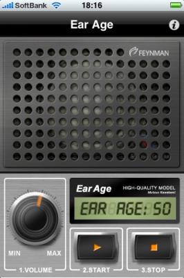 アップル社のiPhone向けアプリケーションを専門に開発・販売する株式会社FEYNMAN(本社:東京都渋谷区、代表取締役:八尾憲輔、資本金:500万円、以下、FEYNMAN)は、2009年3月27日、「おじさんには聞こえない音」を使い耳年齢を測定するアプリ「Ear Age」をアップストアより販売開始いたしました。