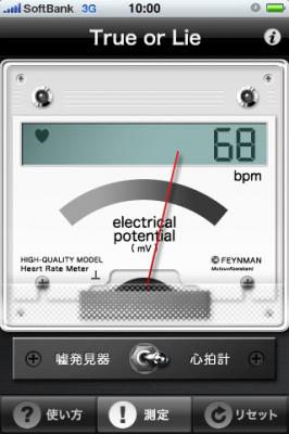 「True or Lie」は、脈の音(心拍数)を測定し、嘘をついているかどうかを判定する嘘発見器です。