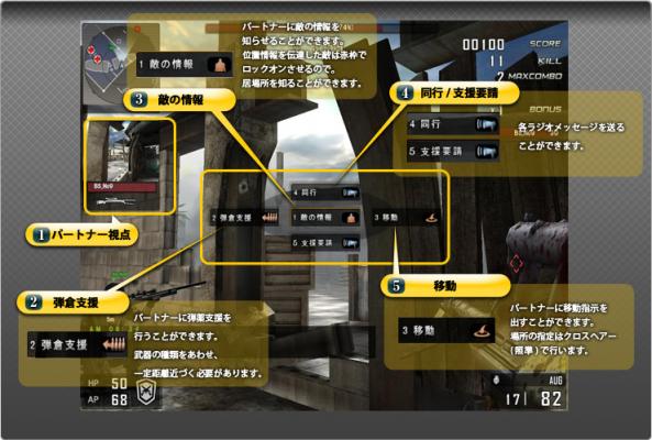 通常の状態では、各武器ごとに持てる マガジン(弾薬)の量が決まっています。 パートナー間では特殊コマンドとして、 同種の武器であれば手持ちのマガジ ンをパートナーに供給することができま す。
