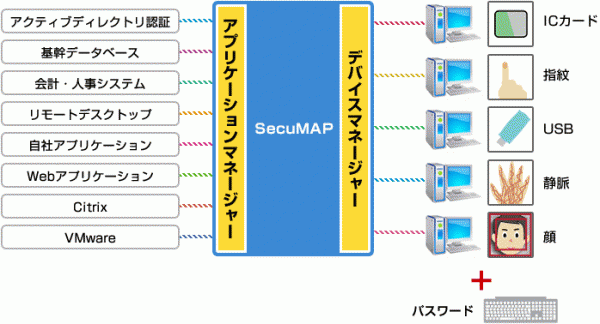 「SecuMAP(セキュマップ)」とは、業務アプリケーションなどの各種アプリケーションのログインを、現在のID、パスワードから、ICカード (FeliCa)、および生体認証(指紋、静脈)などのあらゆるデバイスでの認証に置き換え一元管理するシステムです。新バージョン「SecuMAP(セキュマップ)2.0」は、初期版のリリースから約7ヶ月間に接したユーザーからのさまざまな意見を反映し、セキュリティの強化とユーザビリティの更なる向上を目的としてバージョンアップを行ったものです。ユーザー目線での新機能を追加し、より簡単に運用できるようになりました。