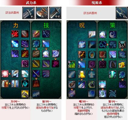 スキルツリーは武器の系統により2種にわかれ、さらに武器ごとに2種存在します。