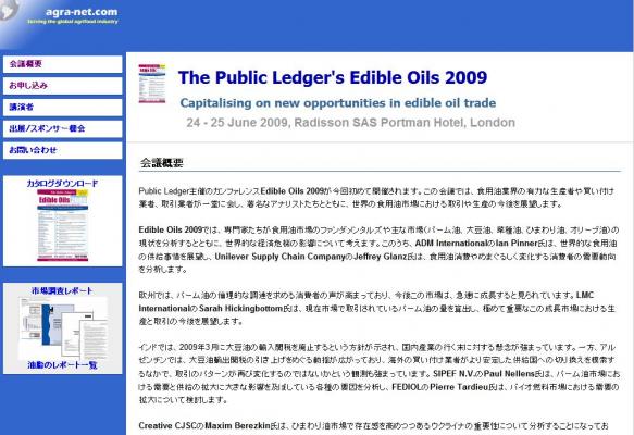 Public Ledger主催のカンファレンスEdible Oils 2009が今回初めて開催されます。この会議では、食用油業界の有力な生産者や買い付け業者、取引業者が一堂に会し、著名なアナリストたちとともに、世界の食用油市場における取引や生産の今後を展望します。