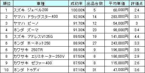 情報流通支援サービスの株式会社オークネット(本社:東京都千代田区/社長:藤崎清孝)は、毎週木曜日開催の二輪中古車TVオークションの成約率上位人気車トップ10をまとめました。