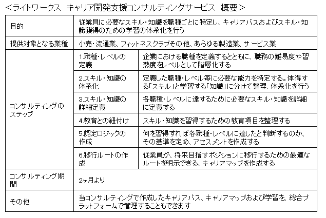 「人こそ商品」という営業理念に基づき、「従業員と会社が一緒に成長する風土づくり」を目指す同社は、学生アルバイトを含めた店舗従業員に対して、業務に求められる能力や、将来への道筋を示すことにより、従業員のモチベーションを高めつつサービス品質の向上を図ろうと、今回、ライトワークスの『キャリア開発支援コンサルティングサービス』の導入を決定しました。