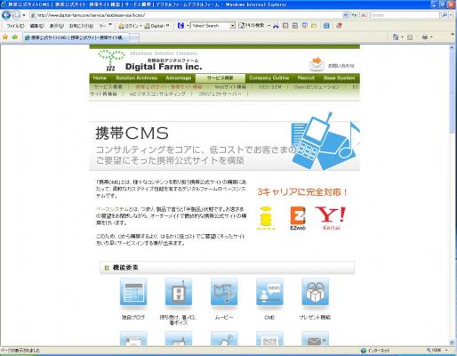 「携帯CMS」とは、様々なコンテンツを取り扱う携帯サイトの構築にあたり、柔軟なカスタマイズ性能を有するデジタルファームのベースシステムです。