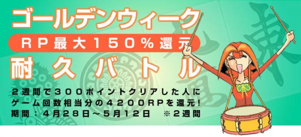 ゲームごとに『トップ:8ポイント、2位:6ポイント、3位:4ポイント、ラス:2ポイント』(東風戦は半分)のポイントを加算して、ゴールデンウィークの2週間で300ポイントクリアした人には、なんと全員にゲーム料金相当分の4200RPを還元します!