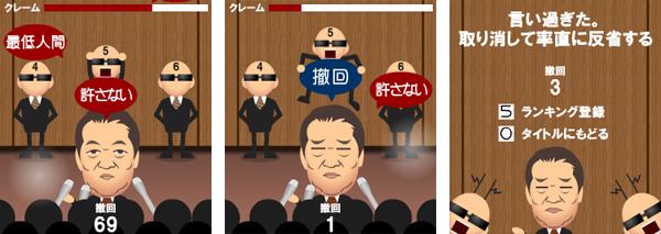 モバイルコンテンツの開発・配信を行う株式会社ライブウェア(本社:東京都新宿区)は、4月30日(金)に携帯電話3キャリアの公式サイト「三文堂」内にて【居眠り大臣もうろう会見】【打ち上げ成功!ディズカバリー!】【人形発見!解けるか「呪い」】【いちろー野球】に続く新作Flashゲーム『「最低人間」撤回大臣』の配信を開始いたしました。