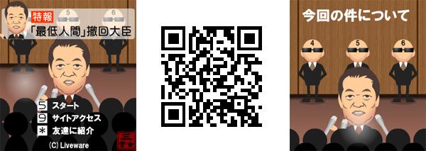 モバイルコンテンツの開発・配信を行う株式会社ライブウェア(本社:東京都新宿区)は、4月30日(金)に携帯電話3キャリアの公式サイト「三文堂」内にて【居眠り大臣もうろう会見】【打ち上げ成功!ディズカバリー!】【人形発見!解けるか「呪い」】【いちろー野球】に続く新作Flashゲーム『「最低人間」撤回大臣』の配信を開始いたしました。