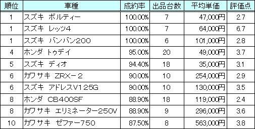 情報流通支援サービスの株式会社オークネット(本社:東京都千代田区/社長:藤崎清孝)は、毎週木曜日開催の二輪中古車TVオークションの成約率上位人気車トップ10をまとめた。