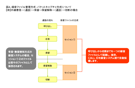 パケットキャプチャ方式による自動録音により、有音無音での検知方式に比べ、録音されていないという事故を低減します。また、音声データの区分も正確に区分され、一通話のデータが二通話分に分割されてしまう事故を防ぎます。(図A参照)