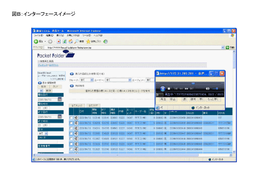 PCのブラウザ上から操作できる使いやすいインターフェイス(図B参照)で、録音・検索・再生・バックアップ/リストア・サーバのディスク管理・状態監視といった豊富な機能をご利用いただけます。
