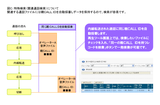 ・録音 ・再生 ・バックアップ/リストア ・サーバのディスク管理 ・状態監視 ・各種検索(録音開始日時/発信・着信区分/CALL ID (図C参照)/発信者番号/着信番号/メモ検索/グループ名/エージェントID/ユーザ名/内線番号/関連通話検索(図C参照)) ・録音ファイルのダウンロード(ZIPファイルでパスワードの有無を選択可能) ・検索結果のCSVファイルのダウンロード