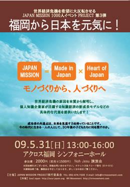 「社会システムを変えるのではなく、人間の意識が変化することが先決である」というコンセプトのもと、どのように人の意識を進化させ、それを新しい産業として興し、雇用を創出し、希望ある感動社会を創建してゆくのか?という大きなテーマについて、日本が持つ可能性について語るのがJAPAN MISSIONです。