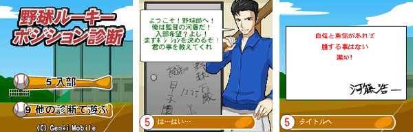 『野球ルーキーポジション診断』は、プレイヤーがもしも野球部に入部したら、どのポジションに向いているかを、プレイヤーの性格から診断するゲームです。