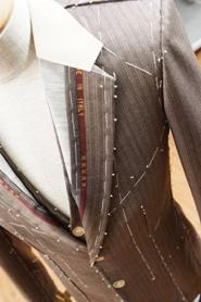 オーダーメイドスーツのミッションを、着た方の体型に応じた最もきれいなシルエットラインを見いだすことであると捉えているめずらしいテーラーです。その特長は「採寸」と「仮縫い」と呼ばれる技法を用いる点で、都合全身30カ所もの採寸を行い、その方に最適なシルエットラインを見つけ出しています。百貨店の紳士服売場などの採寸がおよそ10カ所程度であることを考えるとその採寸ポイントの多さがわかると思います。