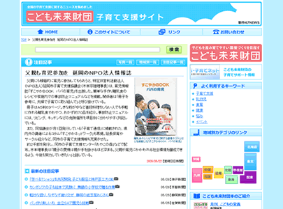 財団法人こども未来財団(東京都港区西新橋3-3-1)と47NEWS(よんななニュース、株式会社全国新聞ネット運営)は27日、「こども未来財団 子育て支援サイト」http://www.47news.jp/service/kosodate/)を開設しました。