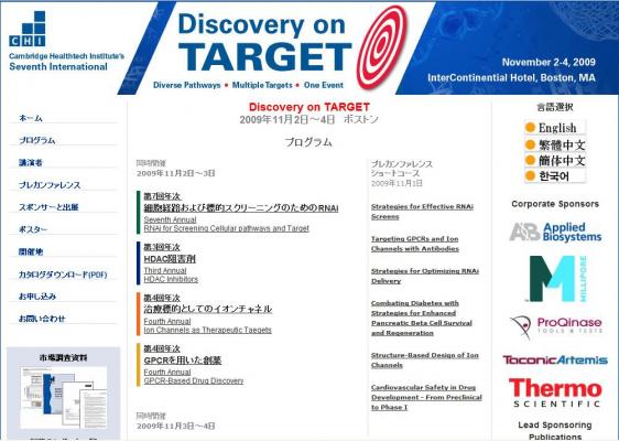 株式会社グローバル インフォメーションでは、皆様の利便性を図る為に、日本語、英語、韓国語、中国語で「Discovery on TARGET」の情報を提供するとともに、会議の参加のお申し込みを承っております。