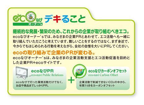 ecoなびオーナー’sでは年間12,000円の登録料で会社、お店、商品等をPRできる、カーボンオフセット付PRサイトにご参加いただけます。