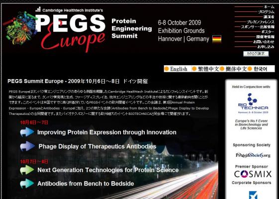 PEGS Europeはタンパク質エンジニアリングのあらゆる側面を網羅したCambridge Healthtech Instituteによるカンファレンスイベントです。創薬から臨床に至るまで、タンパク質発現と生成、ファージディスプレイ法、抗体エンジニアリングなどの手法や技術に関する最新動向を聞くことができます。このイベントは米国ですでに高く評価されているPEGSイベントの欧州開催イベントです。この会議は、第3回Annual Protein Expression - EuropeとAntibodies - Europeに加え、2つの新たな会議(Antibodies from Bench to BedsideとPhage Display to Develop Therapeutics)の合同開催です。